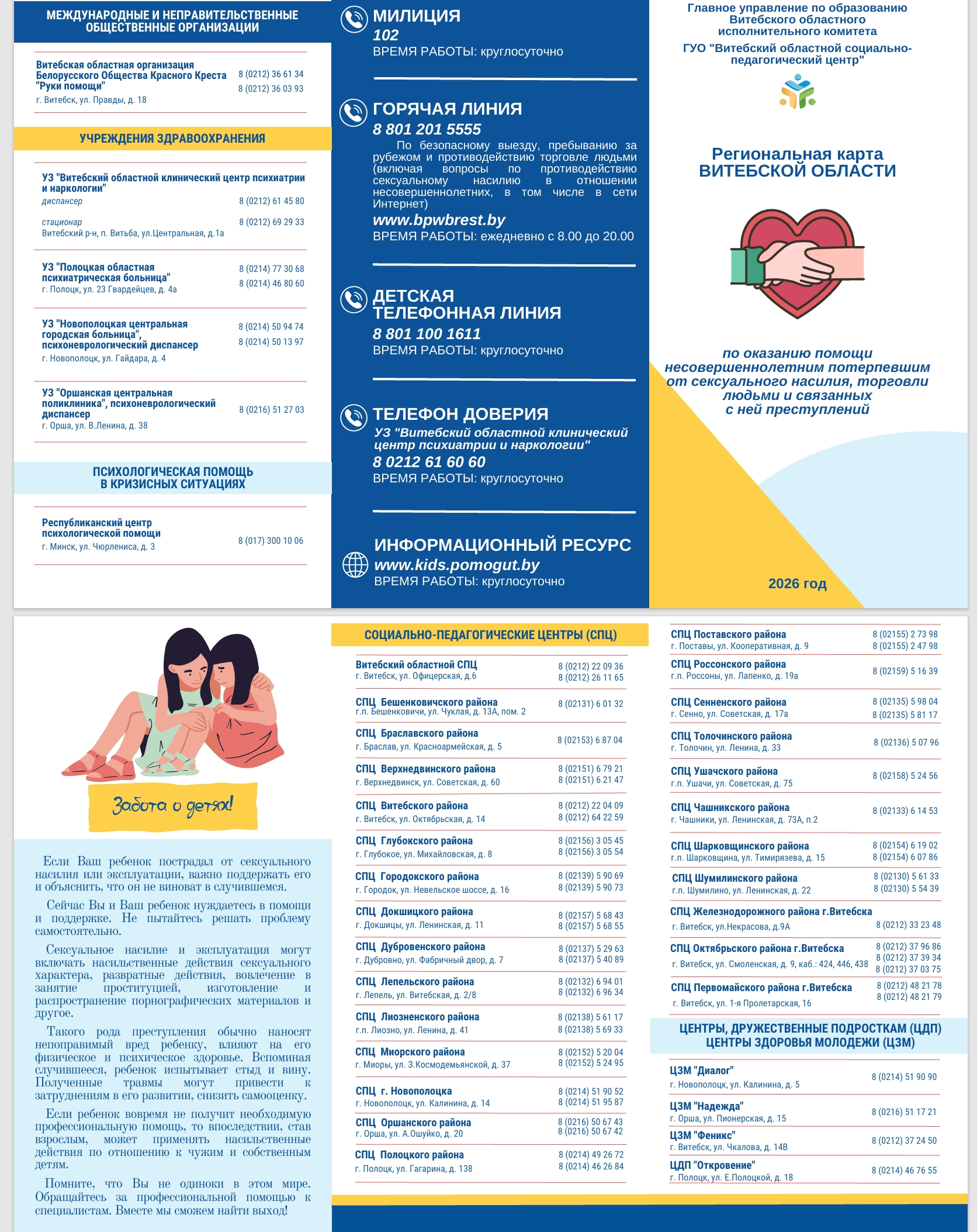 ГУ «Территориальный центр социального обслуживания населения Железнодорожного района г.Витебска», «кризисная комната» (для размещения родителей с детьми)г.Витебск, ул.Космонавтов, д.5апонедельник-пятница 8.00-17.00   круглосуточно8 (0212) 67 92 79 8 (0212) 67 92 83   8 (029) 514 11 81 8 (0212) 67 86 02