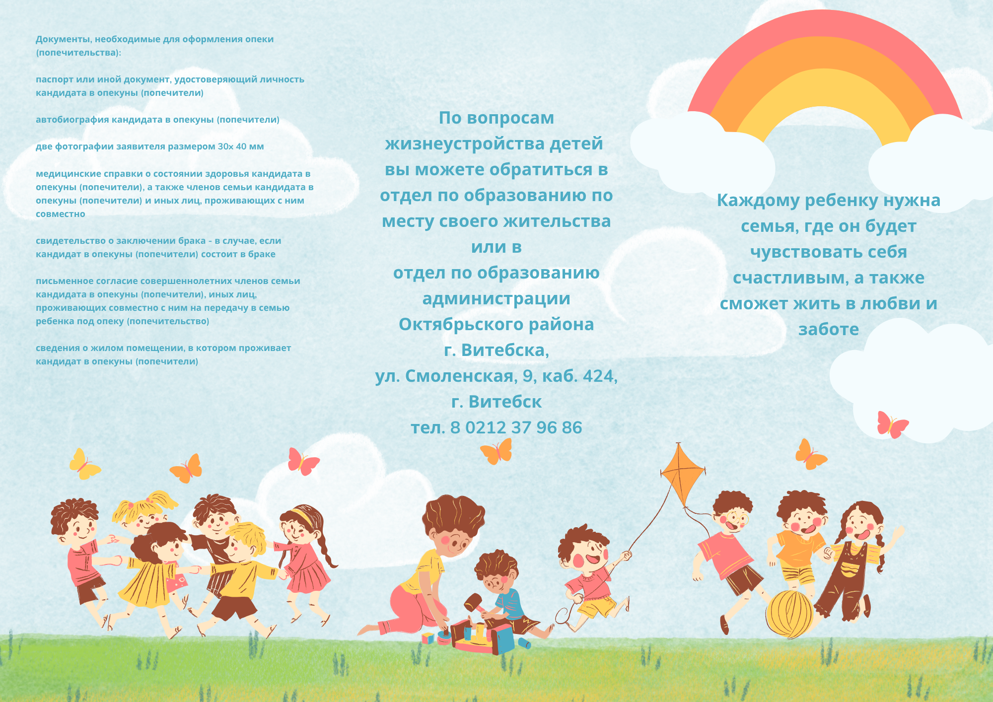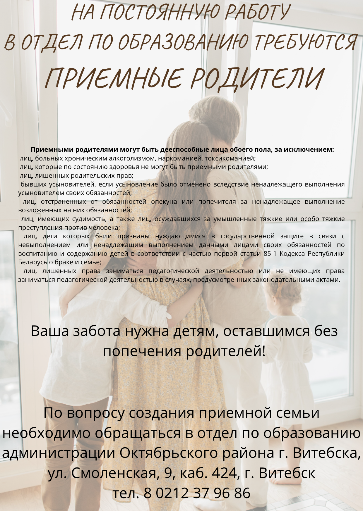 Полную информацию о возможностях стать усыновителем, опекуном (попечителем), приемным родителем, патронатным воспитателем, можно получить в кабинете 424 отдела по образованию администрации Октябрьского района г.Витебска у главного специалиста отдела Галян Ирины Петровны, контактный телефон +375 (212) 37 96 86.